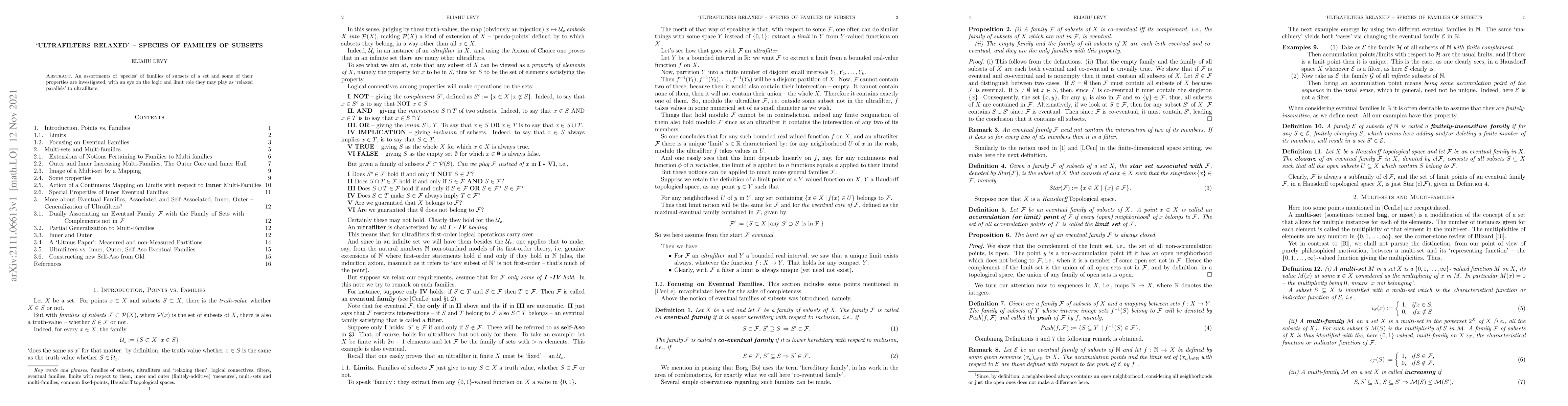 An assortments of `species' of families of subsets of a set and some of their properties are investigated, with an eye on the logic and limit role they may play as `relaxed parallels' to ultrafilters.