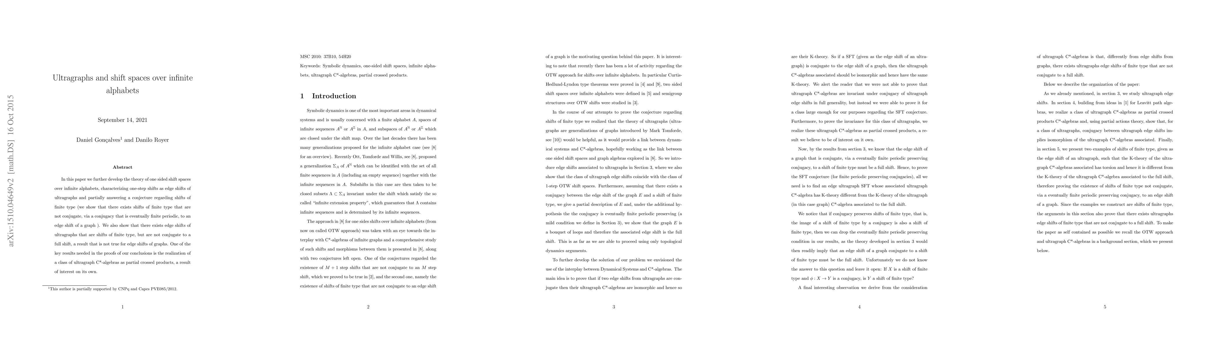 In this paper we further develop the theory of one sided shift spaces over infinite alphabets, characterizing one-step shifts as edge shifts of ultragraphs and partially answering a conjecture regarding shifts of finite type (we show that there exists shifts of finite type that are not conjugate, via a conjugacy that is eventually finite periodic, to an edge shift of a graph ). We also show that there exists edge shifts of ultragraphs that are shifts of finite type, but are not conjugate to a full shift, a result that is not true for edge shifts of graphs. One of the key results needed in the proofs of our conclusions is the realization of a class of ultragraph C*-algebras as partial crossed products, a result of interest on its own.