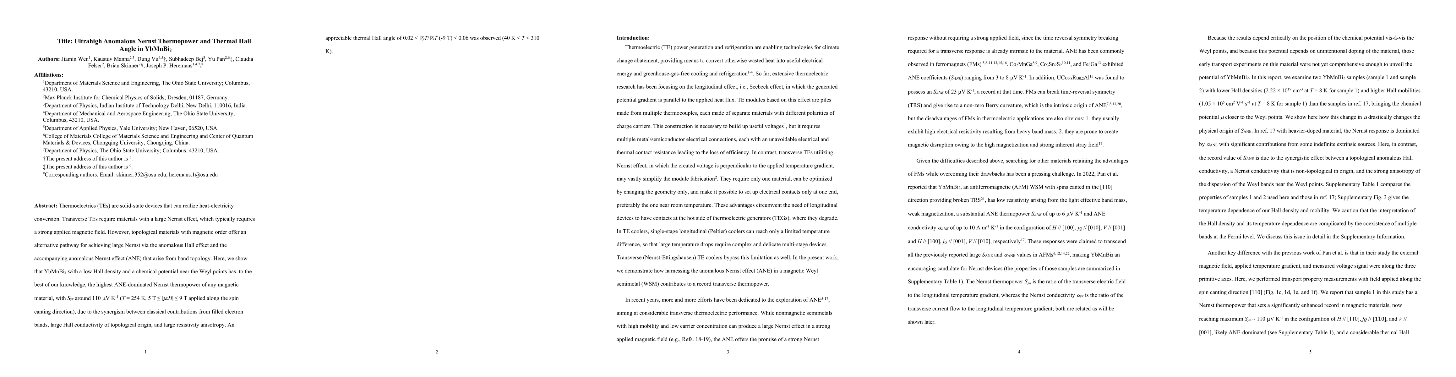 The study presents a detailed analysis of the ultrahigh anomalous Nernst thermopower and thermal Hall angle in YbMnBi2, highlighting the material's potential for advanced thermoelectric applications.
