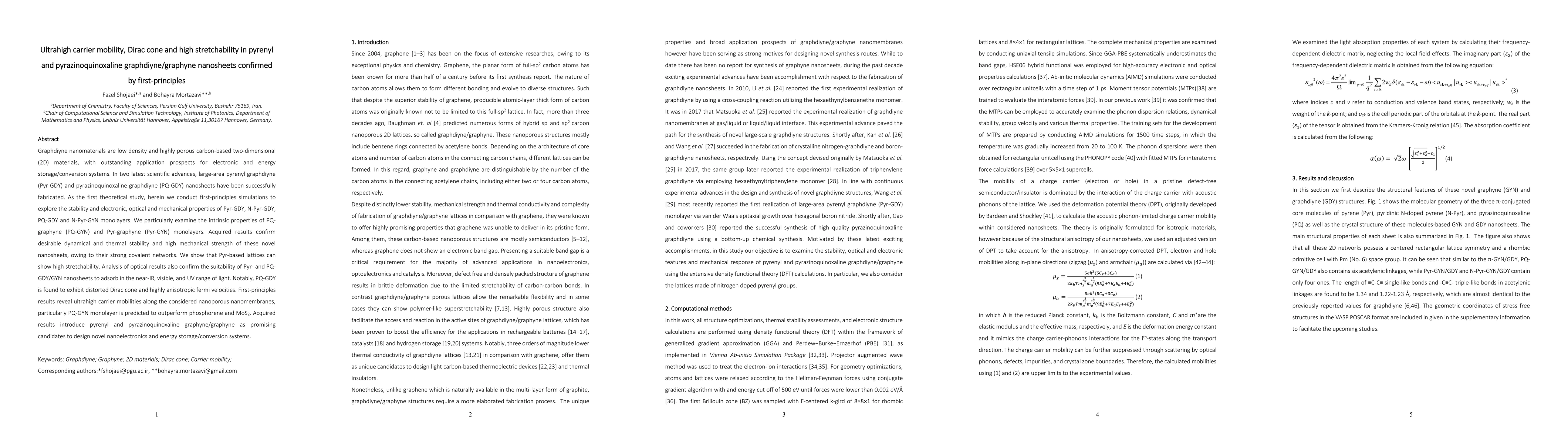 This study uses first-principles simulations to investigate the stability and properties of pyrenyl and pyrazinoquinoxaline graphdiyne/graphyne nanosheets, revealing ultrahigh carrier mobility, high stretchability, and strong mechanical strength, making them promising for nanoelectronics and energy systems.