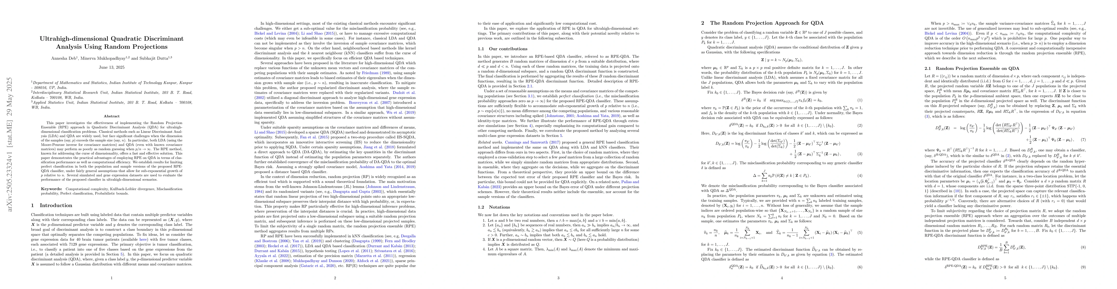 This paper investigates using Random Projection Ensemble (RPE) in Quadratic Discriminant Analysis for high-dimensional classification problems, showing improved performance and efficiency.