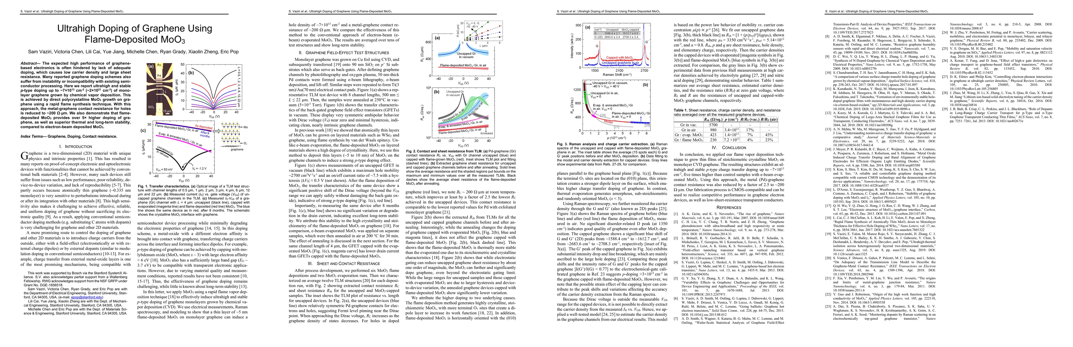 This paper reports ultrahigh and stable p-type doping of monolayer graphene using flame-deposited MoO3, achieving a carrier density of ~7x10^13 1/cm^2 and reducing contact resistance to ~200 Ohm-um, demonstrating superior thermal and long-term stability compared to electron-beam deposited MoO3.