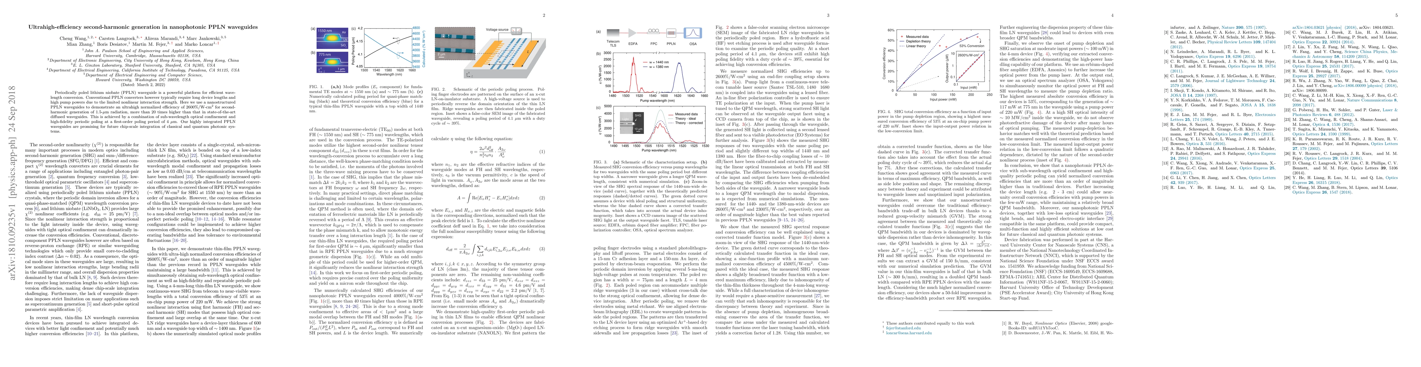 The research utilizes nanostructured PPLN waveguides with sub-wavelength optical confinement and high-fidelity periodic poling at a first-order poling period of 4 µm to achieve ultrahigh normalized efficiency for second-harmonic generation.