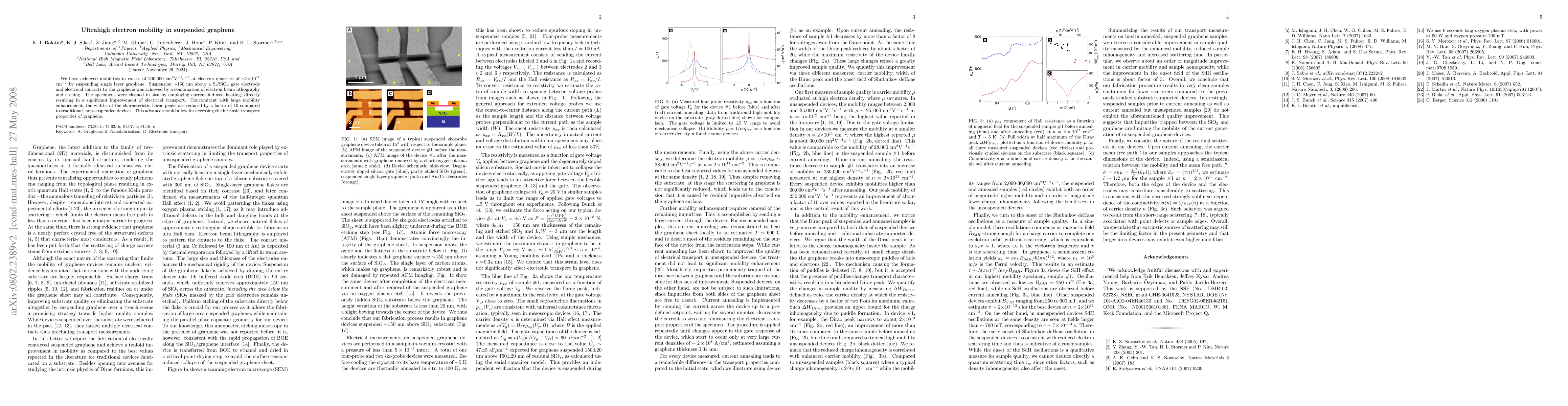This study reports ultrahigh electron mobility exceeding 200,000 cm^2/Vs in suspended single-layer graphene, achieved by suspending the graphene 150 nm above a Si/SiO_2 gate electrode, leading to a tenfold reduction in Dirac peak widths compared to conventional devices.