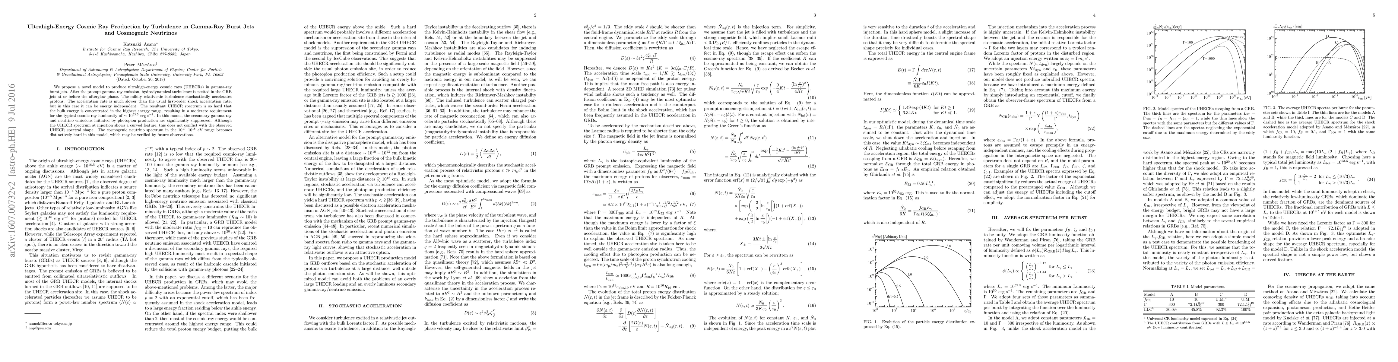 This paper proposes a new model for ultrahigh-energy cosmic ray (UHECR) production in gamma-ray burst jets through hydrodynamical turbulence, which stochastically accelerates protons. The model predicts a hard UHECR spectrum and a distinctively hard cosmogenic neutrino spectrum in the $10^{17}$--$10^{18}$ eV range, potentially verifiable by future observations.