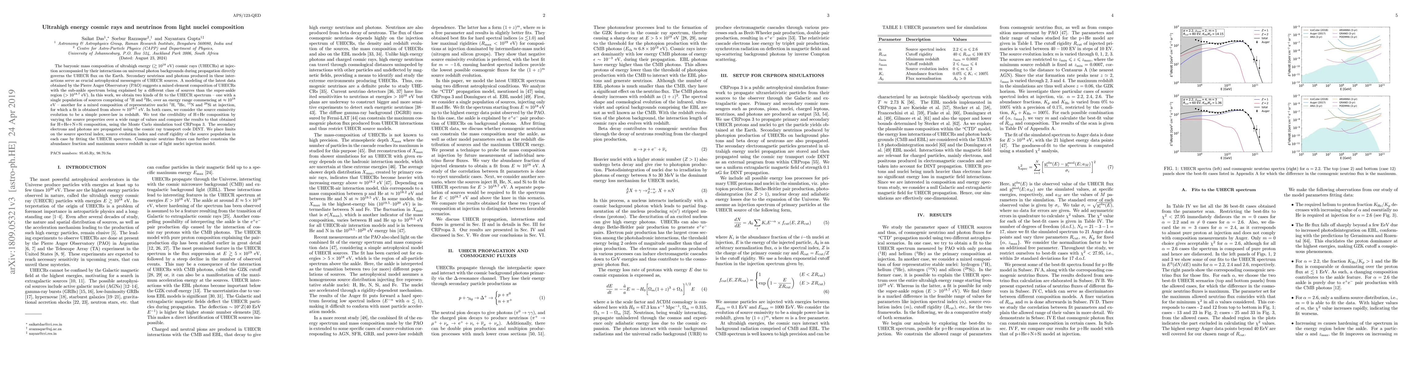 This paper investigates the baryonic mass composition of ultrahigh energy cosmic rays (UHECRs) and their interactions, proposing two models: one with a single population of H and He nuclei, and another with a mixed composition of H, He, N, and Si nuclei. The study uses the Pierre Auger Observatory data and Monte Carlo simulations to compare the two models, aiming to constrain source properties and cosmogenic neutrino fluxes.