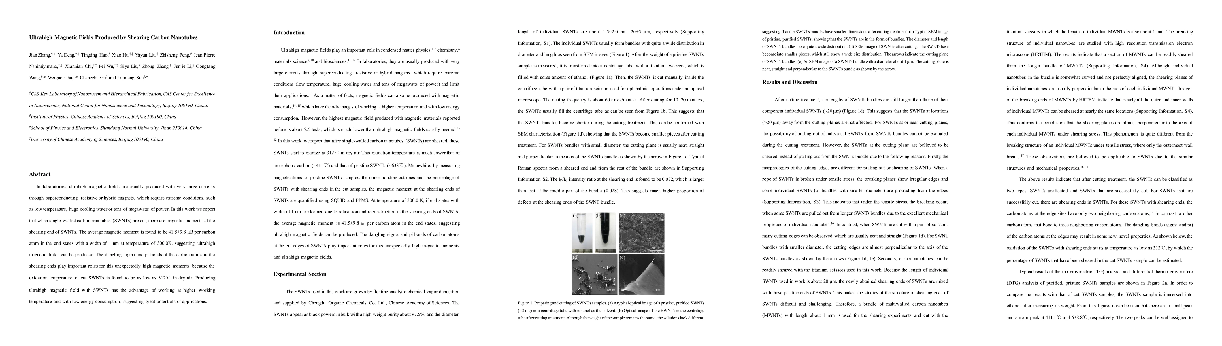 This research demonstrates that shearing single-walled carbon nanotubes (SWNTs) generates magnetic moments at the cut ends, producing ultrahigh magnetic fields of 41.5±9.8 μB per carbon atom. This method offers a low-energy, high-temperature alternative to conventional magnetic field production techniques.