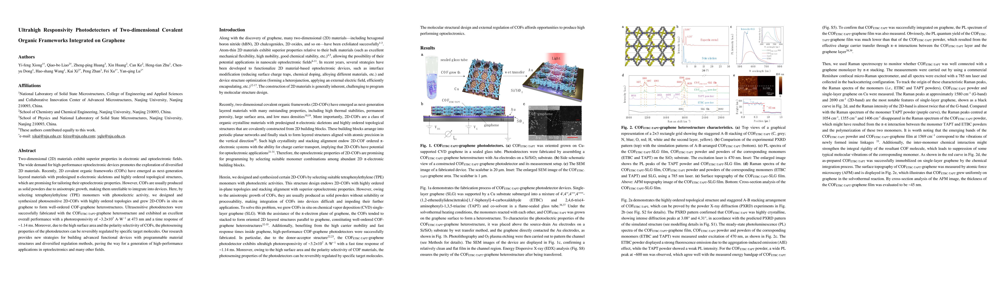 This paper reports the synthesis of photosensitive 2D covalent organic frameworks (COFs) grown on graphene to create ultrahigh responsivity photodetectors. The integration of COFs on graphene results in heterostructures that exhibit excellent optoelectronic performance and reversible regulation by target molecules, offering new strategies for advanced optoelectronic devices.
