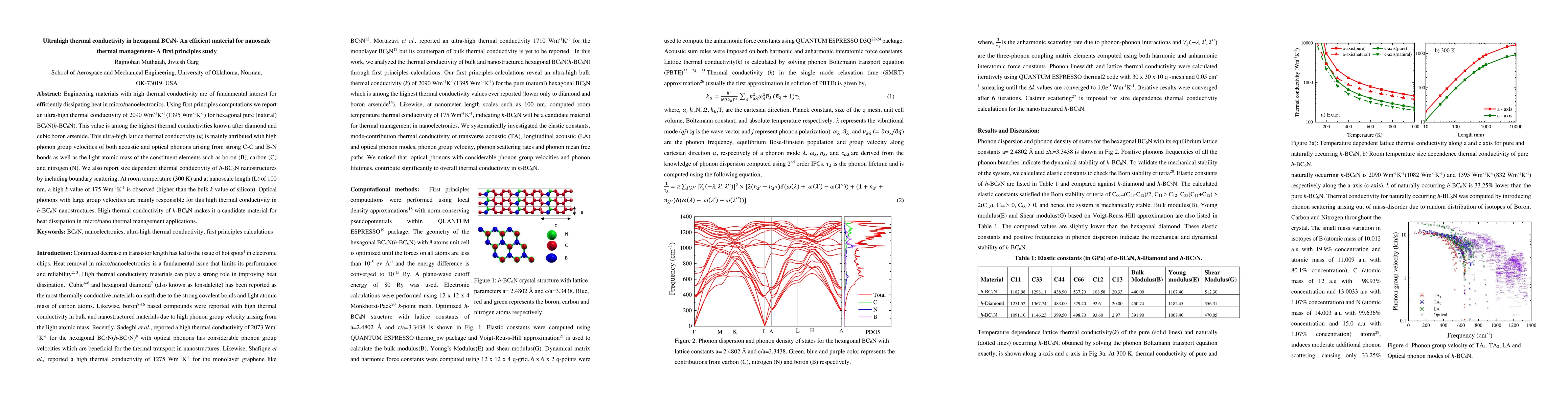 The paper reports an ultrahigh thermal conductivity of 2090 Wm⁻¹K⁻¹ in hexagonal BC6N, attributed to strong C-C and B-N bonds and light atomic mass. Nanoscale h-BC6N maintains high thermal conductivity (175 Wm⁻¹K⁻¹ at 100 nm), suggesting it as an efficient material for nanoscale thermal management.