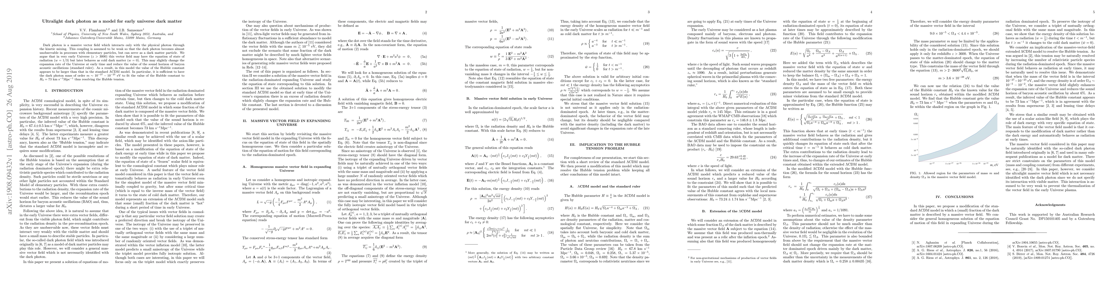 Dark photon is a massive vector field which interacts only with the physical photon through the kinetic mixing. This coupling is assumed to be weak so that the dark photon becomes almost unobservable in processes with elementary particles, but can serve as a dark matter particle. We argue that in very early Universe ($z>3000$) this vector field may have the equation of state of radiation ($w=1/3$) but later behaves as cold dark matter ($w=0$). This may slightly change the expansion rate of the Universe at early time and reduce the value of the sound horizon of baryon acoustic oscillations (standard ruler). As a result, in this model the value of the Hubble constant appears to be larger than that in the standard $\Lambda$CDM model. In particular, it is sufficient to have the dark photon mass of order $m\sim 10^{-27}-10^{-25}$ eV to fit the value of the Hubble constant to $H_0 = 73$ km$\cdot$s$^{-1}$Mpc$^{-1}$ thus resolving the Hubble tension.