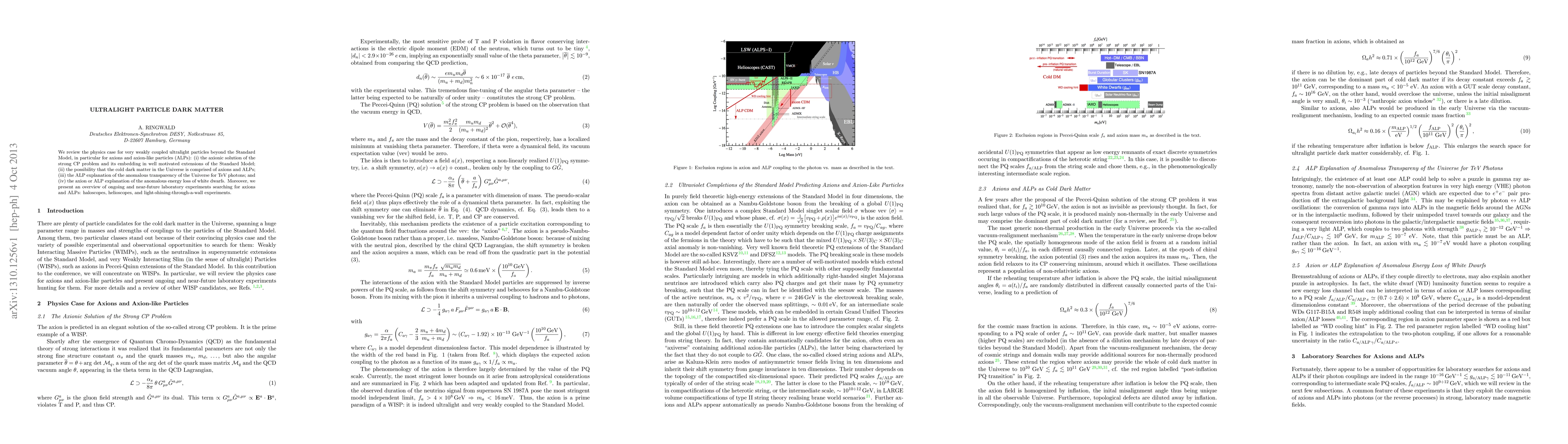 We review the physics case for very weakly coupled ultralight particles beyond the Standard Model, in particular for axions and axion-like particles (ALPs): (i) the axionic solution of the strong CP problem and its embedding in well motivated extensions of the Standard Model; (ii) the possibility that the cold dark matter in the Universe is comprised of axions and ALPs; (iii) the ALP explanation of the anomalous transparency of the Universe for TeV photons; and (iv) the axion or ALP explanation of the anomalous energy loss of white dwarfs. Moreover, we present an overview of ongoing and near-future laboratory experiments searching for axions and ALPs: haloscopes, helioscopes, and light-shining-through-a-wall experiments.