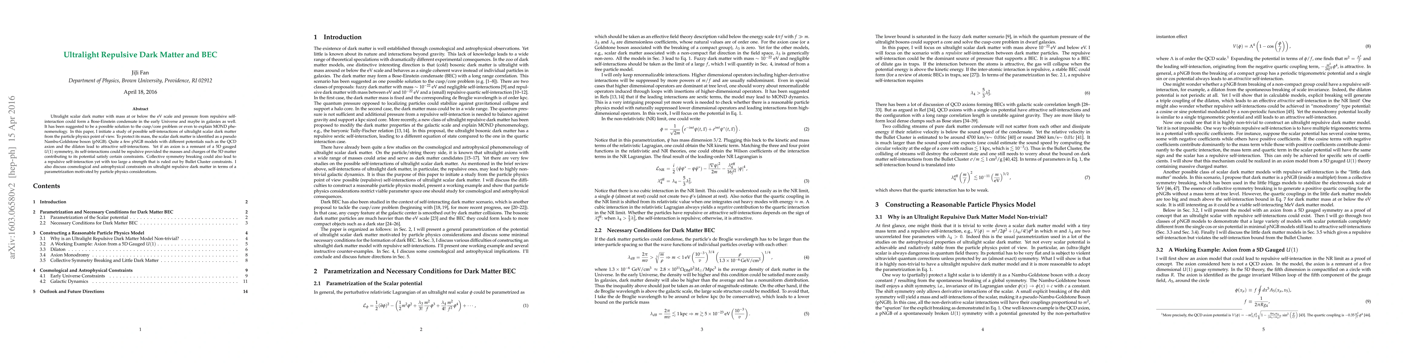 This paper explores ultralight scalar dark matter with repulsive self-interactions, potentially forming Bose-Einstein condensates, as a solution to the cusp/core problem or MOND. It identifies pseudo Nambu-Goldstone bosons, like the QCD axion, as candidates and discusses models with repulsive interactions under specific constraints.