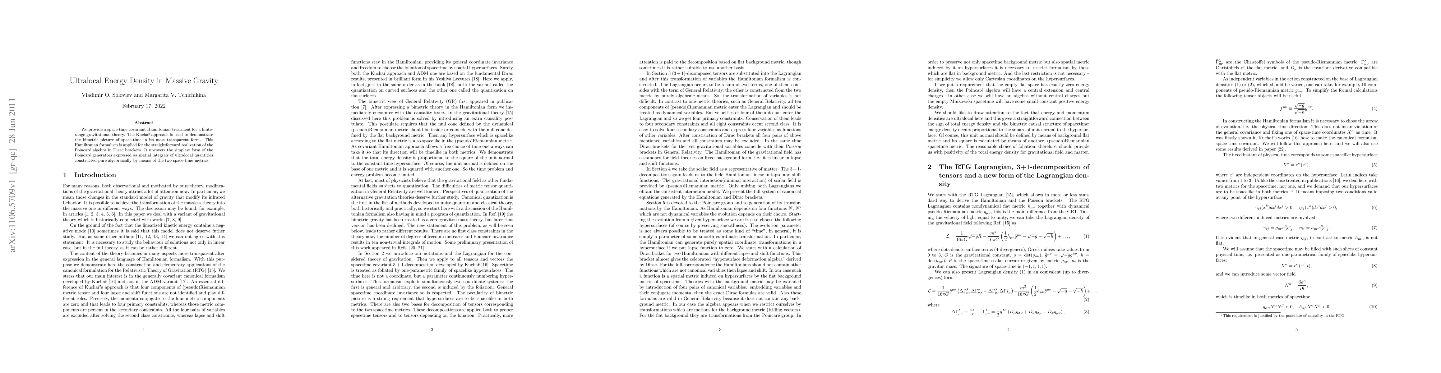 We provide a space-time covariant Hamiltonian treatment for a finite-range gravitational theory. The Kuchar approach is used to demonstrate the bimetric picture of space-time in its most transparent form. This Hamiltonian formalism is applied for the straightforward realization of the Poincar\'e algebra in Dirac brackets. It uncovers the simplest form of the Poincar\'e generators expressed as spatial integrals of ultralocal quantities constructed pure algebraically by means of the two space-time metrics.