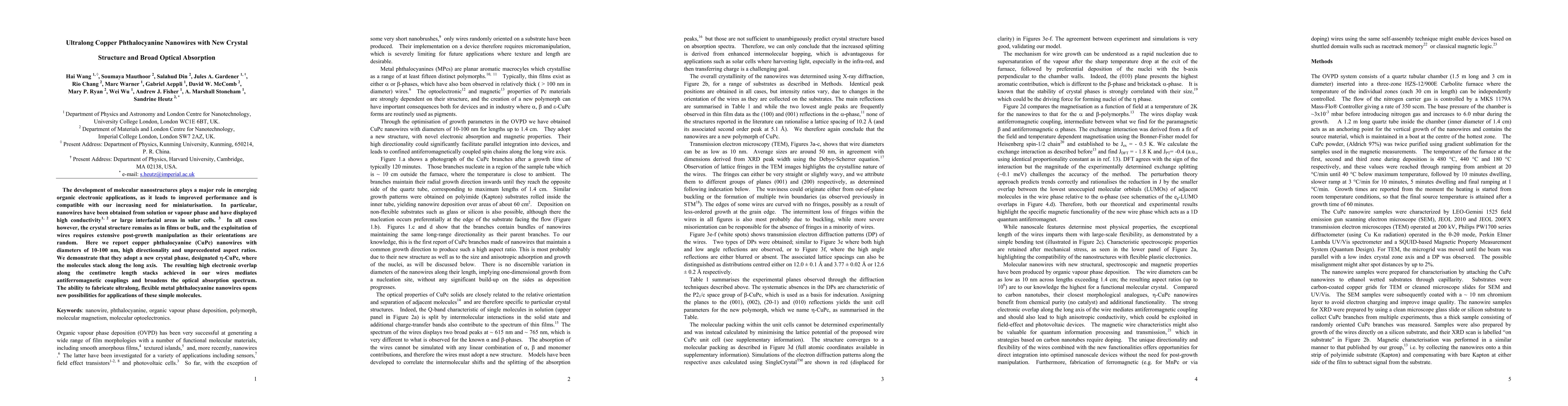 This paper reports the synthesis of ultralong copper phthalocyanine nanowires with a novel eta-CuPc crystal structure, showing high directionality and aspect ratios. The new crystal phase broadens optical absorption and enables antiferromagnetic couplings, promising enhanced applications in organic electronics.