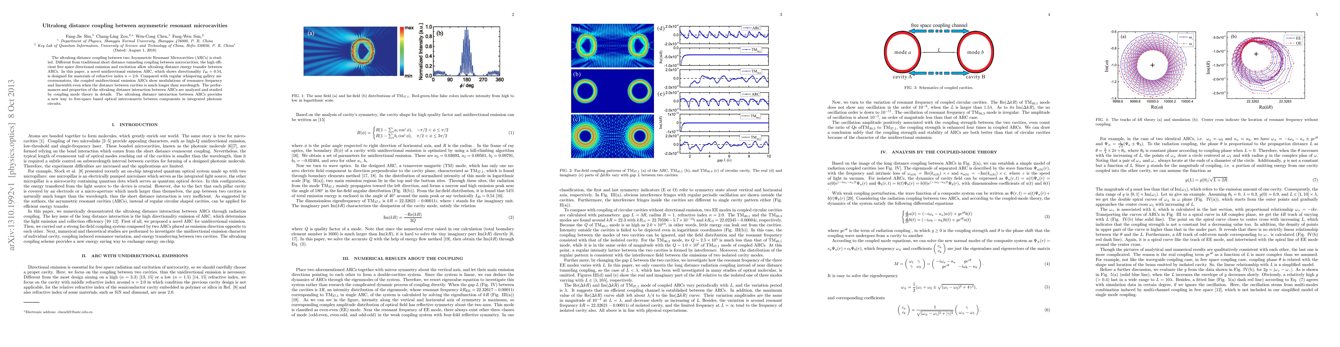 This paper investigates ultralong distance coupling between asymmetric resonant microcavities (ARCs) using high efficient free space directional emission, enabling energy transfer over significant distances. A novel unidirectional emission ARC with directionality I40 = 0.54 is designed, demonstrating modulations in resonance frequency and linewidth even at large cavity separations, offering a new approach for free-space optical interconnects in photonic circuits.