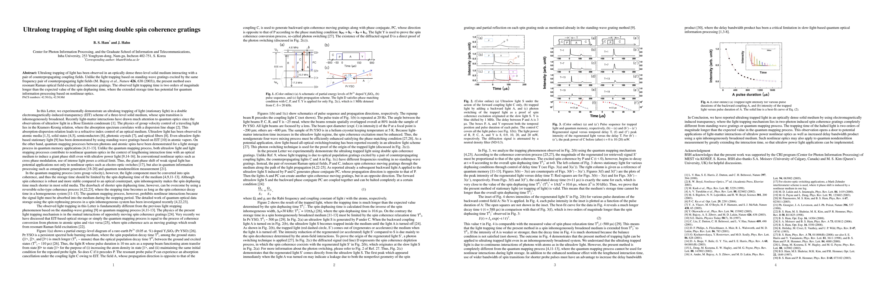 This paper reports ultralong trapping of light in a three-level solid medium using resonant Raman optical field-excited spin coherence gratings, achieving a trapping time two orders of magnitude longer than typical spin dephasing times, with potential applications in quantum information processing.