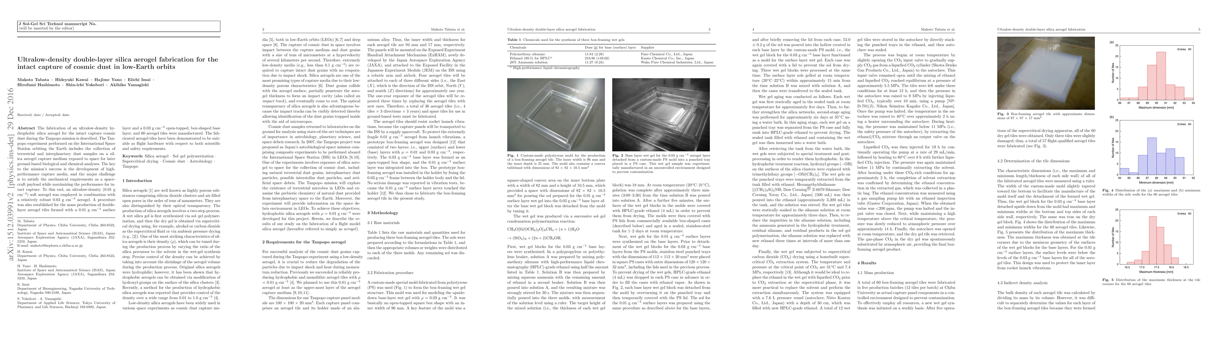 The fabrication of an ultralow-density hydrophobic silica aerogel for the intact capture cosmic dust during the Tanpopo mission is described. The Tanpopo experiment performed on the International Space Station orbiting the Earth includes the collection of terrestrial and interplanetary dust samples on a silica aerogel capture medium exposed to space for later ground-based biological and chemical analyses. The key to the mission's success is the development of high-performance capture media, and the major challenge is to satisfy the mechanical requirements as a spacecraft payload while maximizing the performance for intact capture. To this end, an ultralow-density (0.01 g cm$^{-3}$) soft aerogel was employed in combination with a relatively robust 0.03 g cm$^{-3}$ aerogel. A procedure was also established for the mass production of double-layer aerogel tiles formed with a 0.01 g cm$^{-3}$ surface layer and a 0.03 g cm$^{-3}$ open-topped, box-shaped base layer, and 60 aerogel tiles were manufactured. The fabricated aerogel tiles have been demonstrated to be suitable as flight hardware with respect to both scientific and safety requirements.