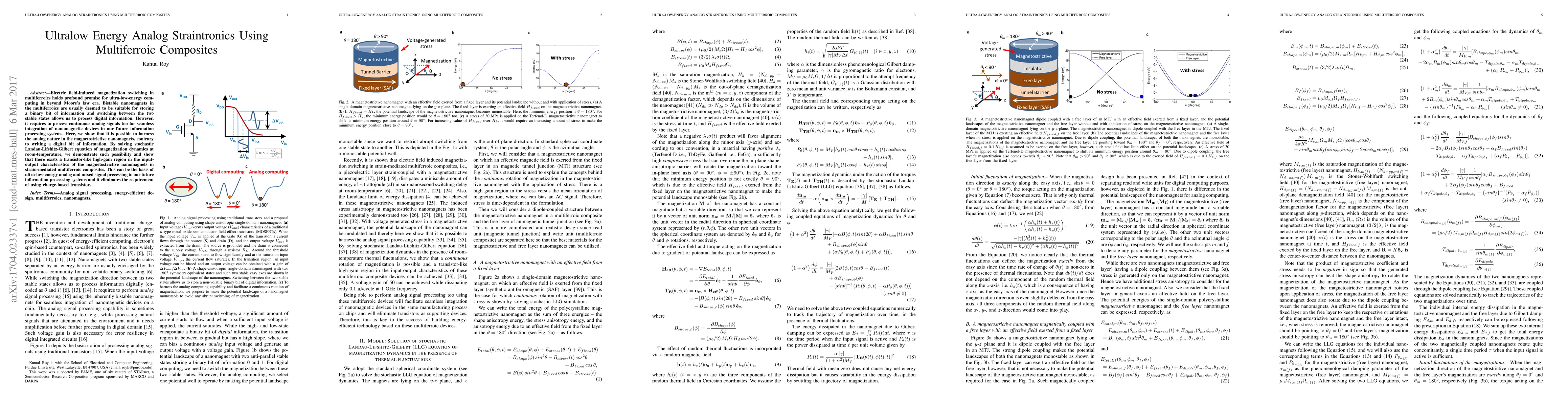 This paper explores the use of multiferroic composites for ultra-low-energy analog straintronics, demonstrating a transistor-like high-gain region in magnetostrictive nanomagnets. This analog processing capability, achieved through strain mediation, promises to enable energy-efficient mixed-signal processing without relying on charge-based transistors.