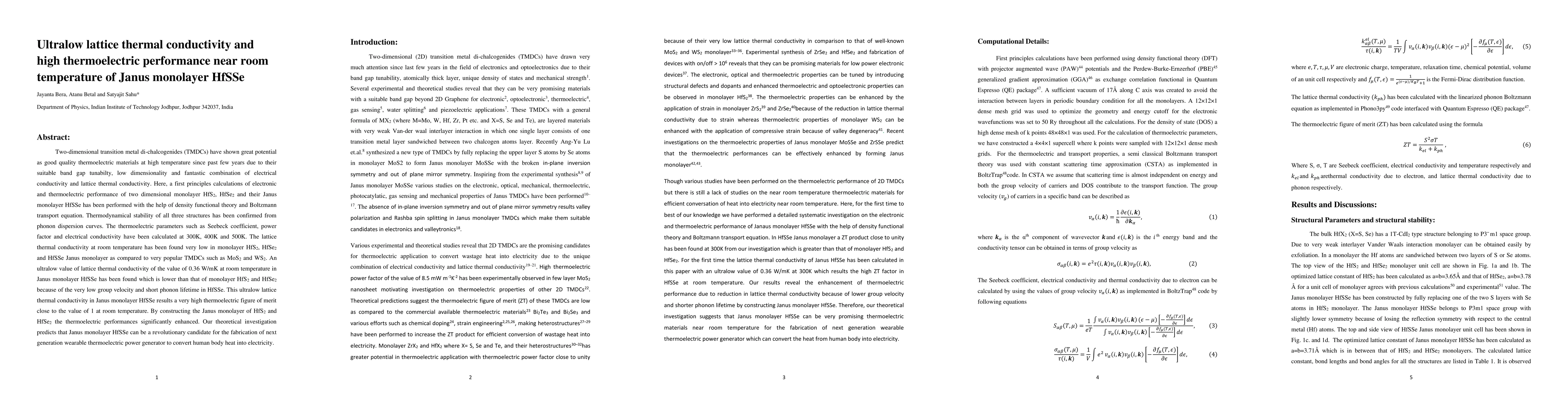 Two-dimensional transition metal di-chalcogenides (TMDCs) have shown great potential as good quality thermoelectric materials at high temperature since past few years due to their suitable band gap tunabilty, low dimensionality and fantastic combination of electrical conductivity and lattice thermal conductivity. Here, a first principles calculations of electronic and thermoelectric performance of two dimensional monolayer HfS 2 , HfSe 2 and their Janus monolayer HfSSe has been performed with the help of density functional theory and Boltzmann transport equation. Thermodynamical stability of all three structures has been confirmed from phonon dispersion curves. The thermoelectric parameters such as Seebeck coefficient, power factor and electrical conductivity have been calculated at 300K, 400K and 500K. The lattice thermal conductivity at room temperature has been found very low in monolayer HfS 2 , HfSe 2 and HfSSe Janus monolayer as compared to very popular TMDCs such as MoS 2 and WS 2 . An ultralow value of lattice thermal conductivity of the value of 0.36 W/mK at room temperature in Janus monolayer HfSSe has been found which is lower than that of monolayer HfS 2 and HfSe 2 because of the very low group velocity and short phonon lifetime in HfSSe. This ultralow lattice thermal conductivity in Janus monolayer HfSSe results a very high thermoelectric figure of merit close to the value of 1 at room temperature. By constructing the Janus monolayer of HfS 2 and HfSe 2 the thermoelectric performances significantly enhanced. Our theoretical investigation predicts that Janus monolayer HfSSe can be a revolutionary candidate for the fabrication of next generation wearable thermoelectric power generator to convert human body heat into electricity.