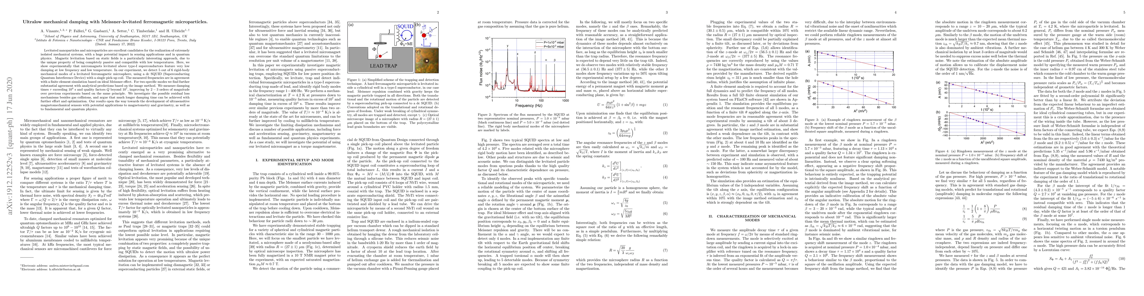 This research demonstrates ultralow mechanical damping in ferromagnetic microparticles levitated above type-I superconductors, achieving quality factors exceeding $10^7$ and damping times over $10^4$ s. The findings suggest significant potential for ultrasensitive magnetomechanical sensors and applications in magnetometry and quantum physics.