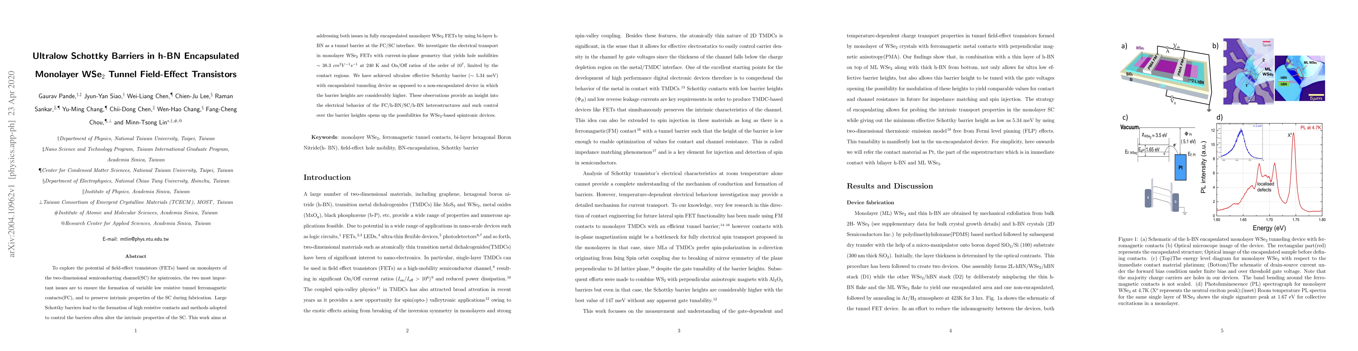 This study investigates ultralow Schottky barriers in fully encapsulated monolayer WSe$_2$ FETs with h-BN as a tunnel barrier, achieving effective Schottky barriers of approximately 5.34 meV and On/Off ratios of 10$^7$, highlighting the potential for WSe$_2$-based spintronic devices while preserving the intrinsic properties of the semiconductor channel.
