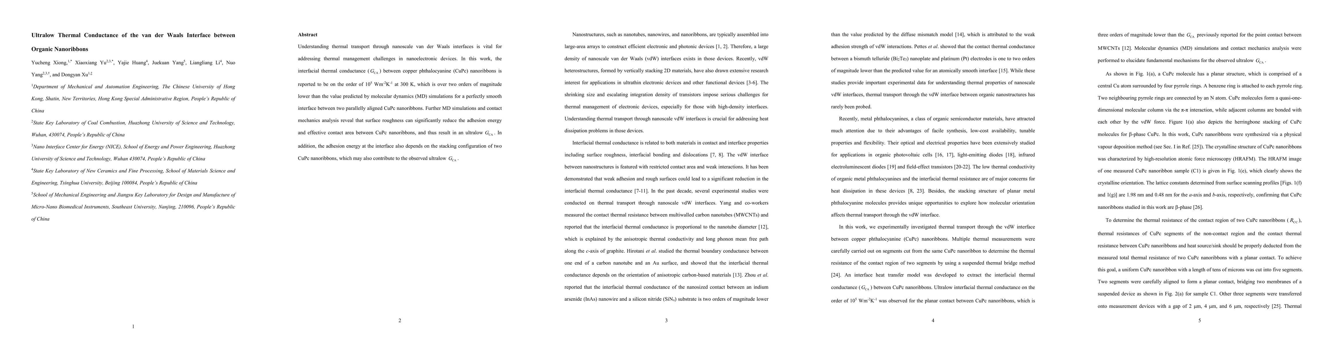 This study reports ultralow interfacial thermal conductance (GCA) between copper phthalocyanine nanoribbons, significantly lower than predicted by molecular dynamics simulations, due to surface roughness reducing adhesion energy and contact area. The stacking configuration of the nanoribbons further influences the adhesion energy, contributing to the observed low GCA.