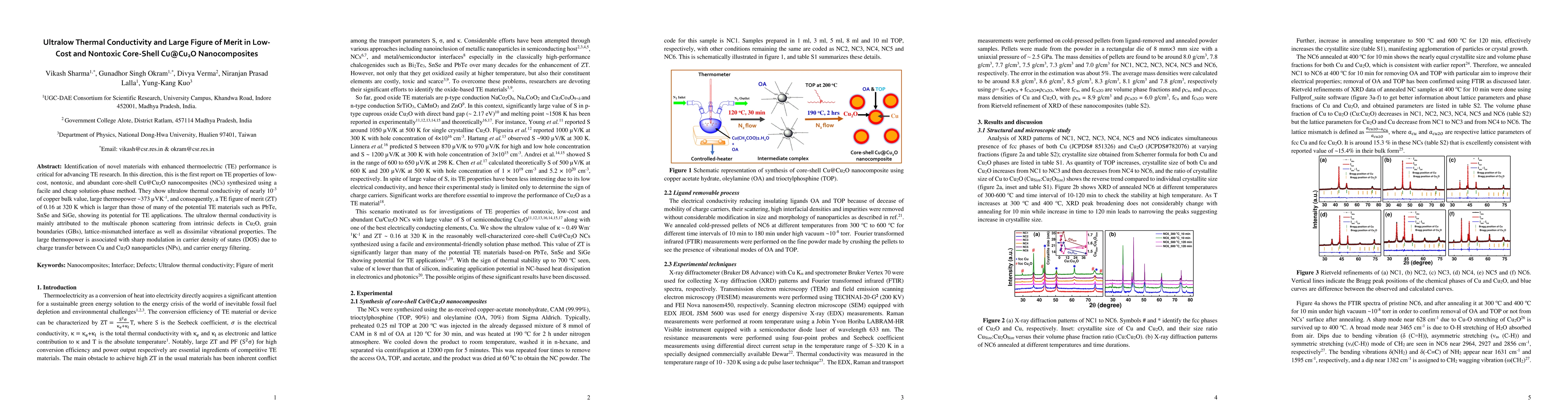 This work distinguishes itself by focusing on low-cost, nontoxic materials, employing a facile synthesis method, and demonstrating ultralow thermal conductivity and large thermopower in core-shell Cu@Cu2O nanocomposites, outperforming several well-known thermoelectric materials