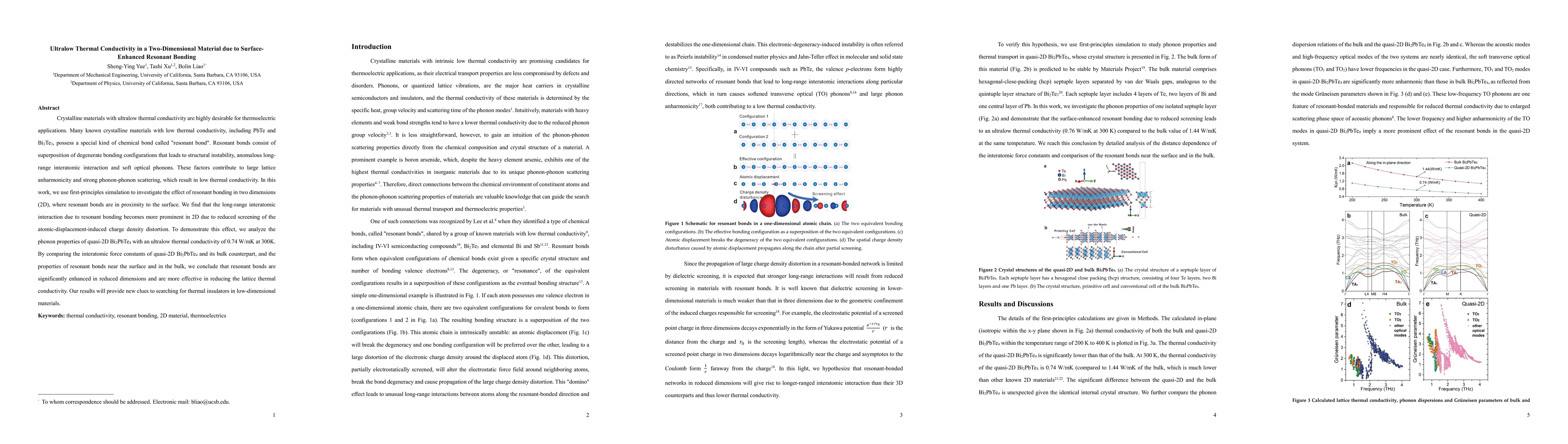 This research demonstrates that two-dimensional (2D) materials with resonant bonds exhibit significantly enhanced phonon scattering due to prominent long-range interatomic interactions, leading to ultralow thermal conductivity. The study finds that quasi-2D Bi2PbTe4 has a thermal conductivity of 0.74 W/mK at 300K, highlighting the potential of resonant bonding in low-dimensional materials for thermoelectric applications.