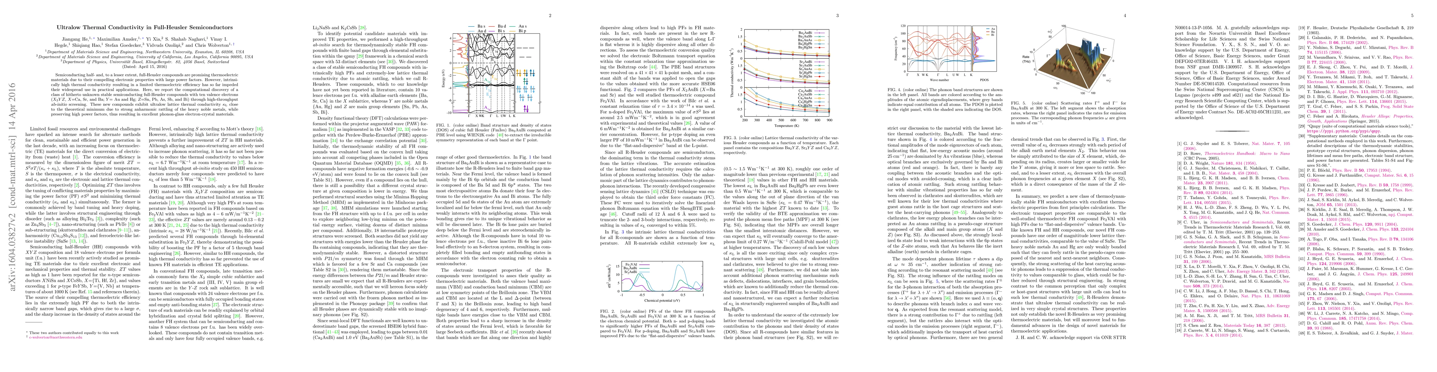 This paper reports the computational discovery of stable semiconducting full-Heusler compounds with ultralow thermal conductivity, achieved through high-throughput $ab-initio$ screening. These materials, with ten valence electrons and heavy noble metals, show promising thermoelectric efficiency due to their low lattice thermal conductivity and high power factors.