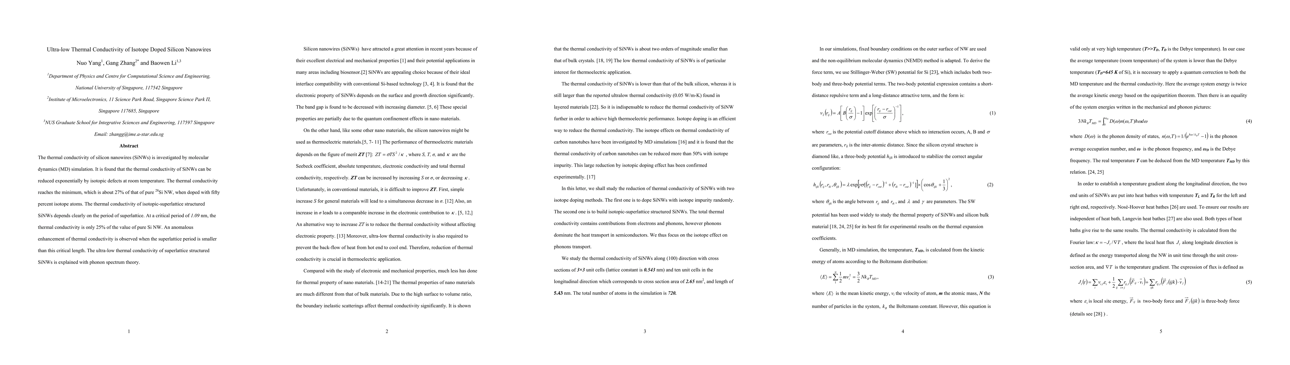This study uses molecular dynamics simulations to demonstrate that isotopic doping significantly reduces the thermal conductivity of silicon nanowires, reaching ultralow values of about 27% of pure silicon at 50% doping. Additionally, isotopic superlattice structures exhibit a critical period of 1.09 nm where thermal conductivity drops to 25% of pure silicon, with a surprising increase below this length, explained by phonon spectrum theory.