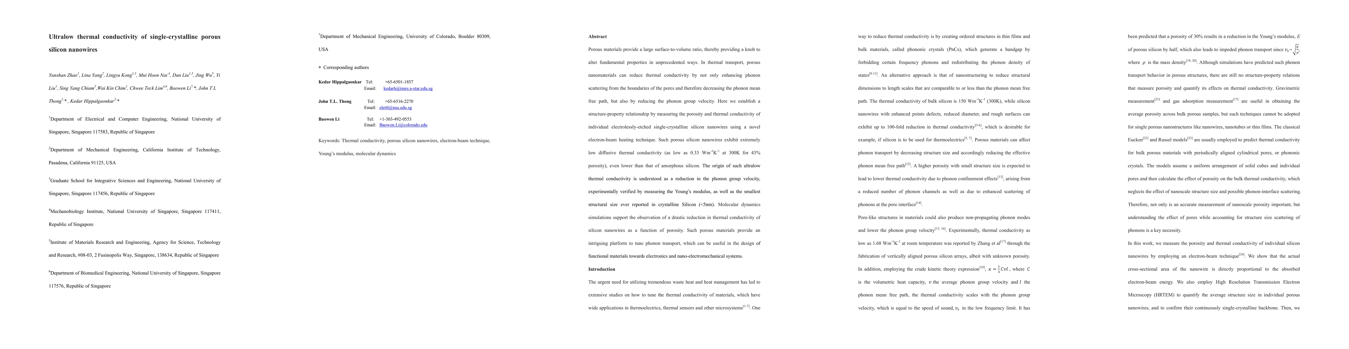 Porous silicon nanowires exhibit ultralow thermal conductivity (as low as 0.33 Wm^-1K^-1) due to phonon scattering and reduced phonon group velocity, demonstrating a novel structure-property relationship. These findings provide a basis for tuning phonon transport in nanomaterials for advanced electronics and nano-electromechanical systems.