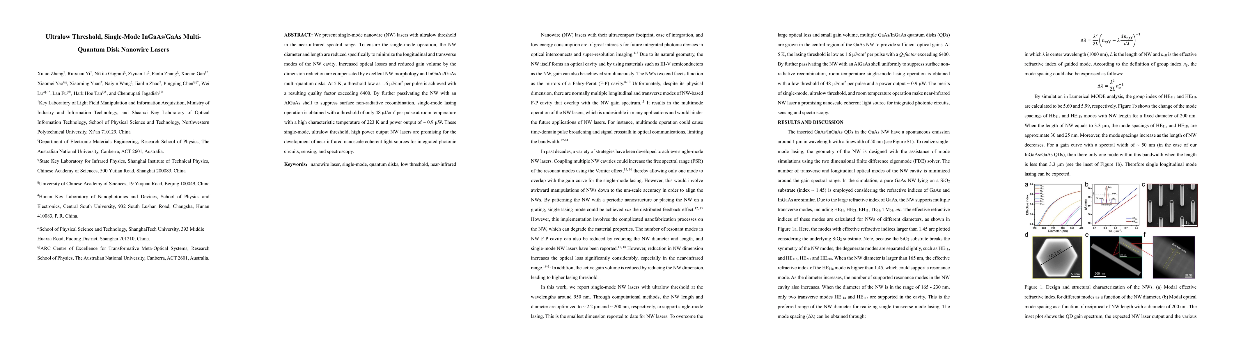 The research presents ultralow threshold, single-mode nanowire lasers for near-infrared light, achieved by controlling nanowire diameter and length to minimize cavity modes. Enhanced performance is maintained through InGaAs/GaAs multi-quantum disks and an AlGaAs shell passivation. At 5K, a threshold of 1.6 μJ/cm² is attained with a Q-factor over 6400. Room temperature operation is demonstrated with a threshold of 48 μJ/cm², high characteristic temperature, and a power output of ~0.9 μW. These lasers are promising for integrated photonics, sensing, and spectroscopy applications.