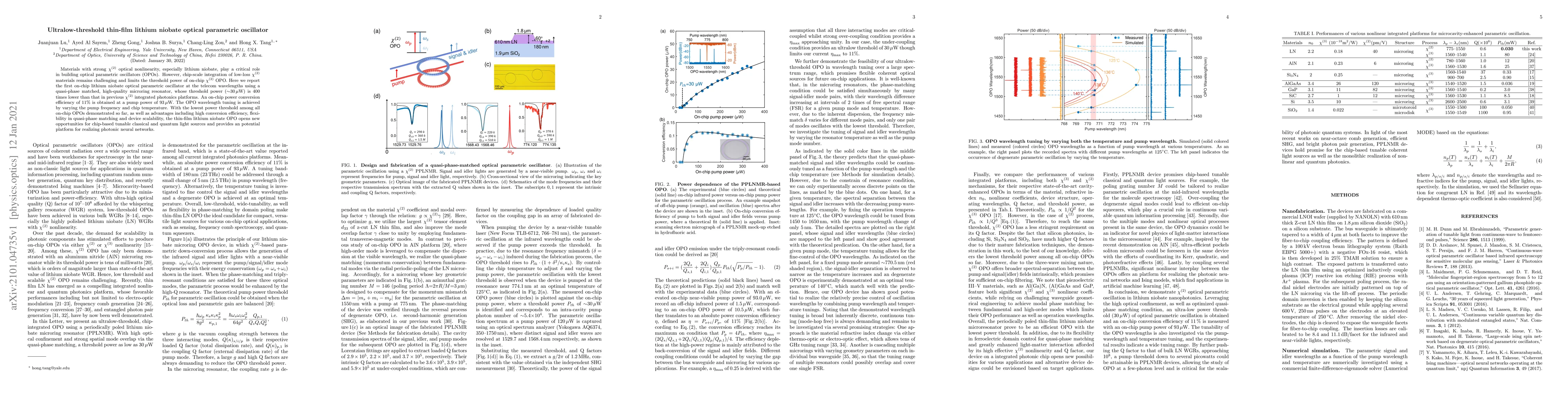 This research introduces an ultralow-threshold, chip-scale optical parametric oscillator (OPO) in thin-film lithium niobate, achieving a threshold power of only 30 µW, significantly lower than previous platforms. The device demonstrates high conversion efficiency and tunable wavelength, promising applications in tunable light sources and photonic neural networks.