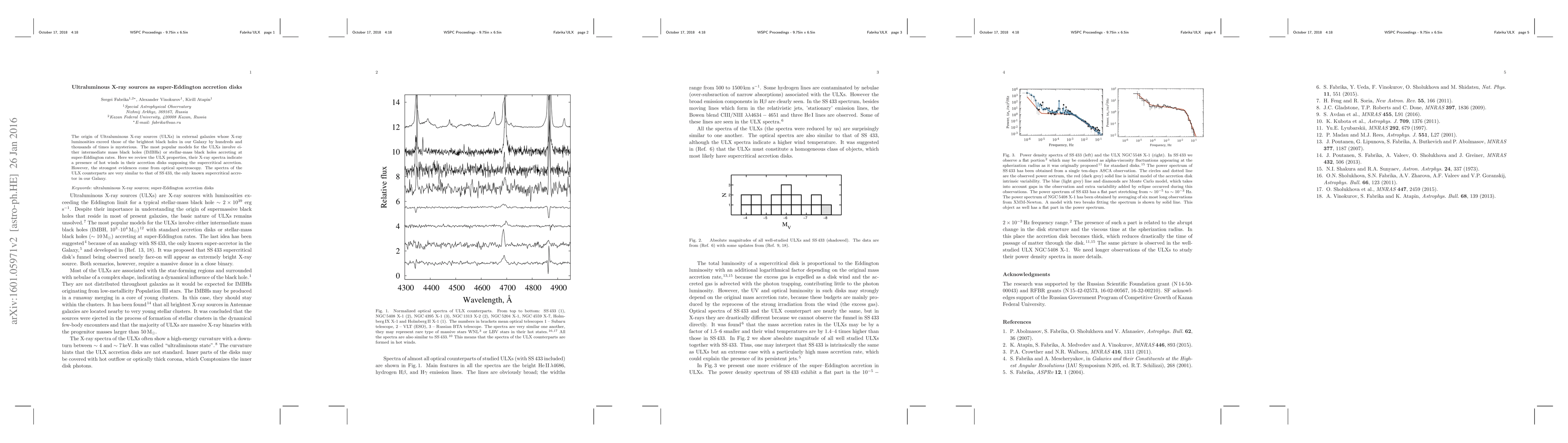 The origin of Ultraluminous X-ray sources (ULXs) in external galaxies whose X-ray luminosities exceed those of the brightest black holes in our Galaxy by hundreds and thousands of times is mysterious. The most popular models for the ULXs involve either intermediate mass black holes (IMBHs) or stellar-mass black holes accreting at super-Eddington rates. Here we review the ULX properties, their X-ray spectra indicate a presence of hot winds in their accretion disks supposing the supercritical accretion. However, the strongest evidences come from optical spectroscopy. The spectra of the ULX counterparts are very similar to that of SS 433, the only known supercritical accretor in our Galaxy.