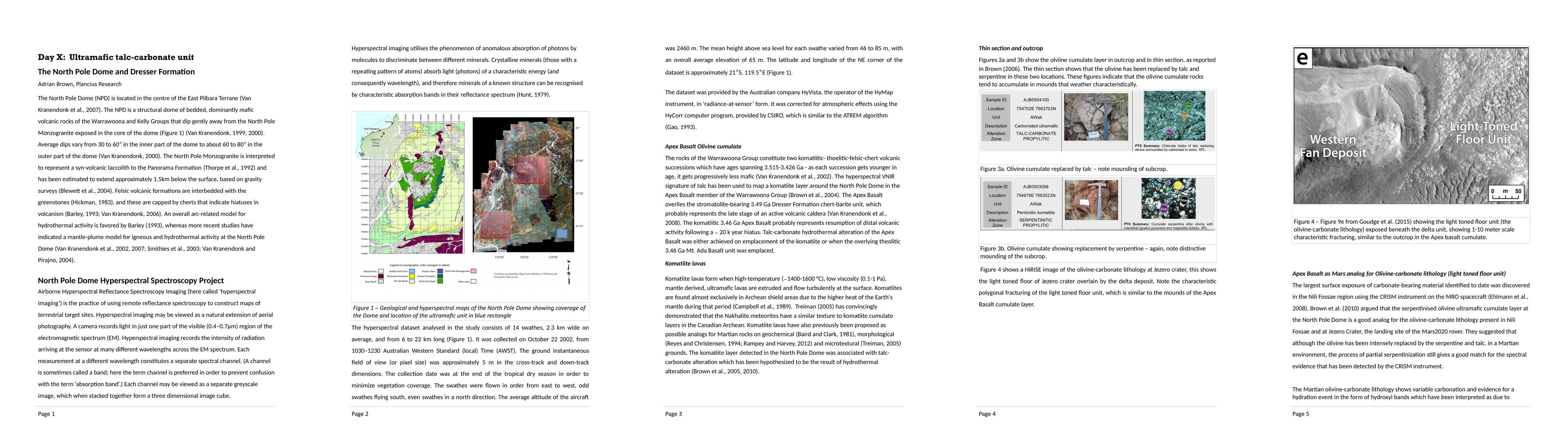 Here we describe the ultramafic talc-carbonate unit of the North Pole Dome. The North Pole Dome (NPD) is located in the centre of the East Pilbara Terrane (Van Kranendonk et al., 2007). The NPD is a structural dome of bedded, dominantly mafic volcanic rocks of the Warrawoona and Kelly Groups that dip gently away from the North Pole Monzogranite exposed in the core of the dome (Figure 1) (Van Kranendonk, 1999, 2000). Average dips vary from 30 to 60 degrees in the inner part of the dome to about 60 to 80 degrees in the outer part of the dome (Van Kranendonk, 2000). The North Pole Monzogranite is interpreted to represent a syn-volcanic laccolith to the Panorama Formation (Thorpe et al., 1992) and has been estimated to extend approximately 1.5km below the surface, based on gravity surveys (Blewett et al., 2004). Felsic volcanic formations are interbedded with the greenstones (Hickman, 1983), and these are capped by cherts that indicate hiatuses in volcanism (Barley, 1993; Van Kranendonk, 2006). An overall arc-related model for hydrothermal activity is favored by Barley (1993), whereas more recent studies have indicated a mantle-plume model for igneous and hydrothermal activity at the North Pole Dome (Van Kranendonk et al., 2002, 2007; Smithies et al., 2003; Van Kranendonk and Pirajno, 2004).