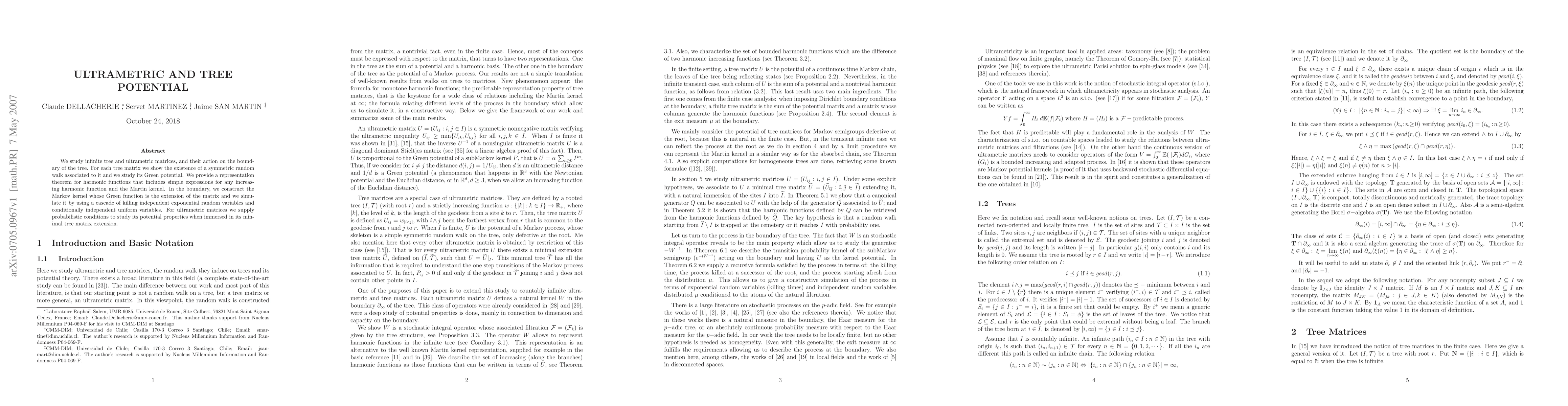 This paper explores infinite tree structures and ultrametric matrices, demonstrating the existence of symmetric random walks and their Green potentials. It provides a representation theorem for harmonic functions and constructs a Markov kernel on the boundary, simulating it through a cascade of killing processes.