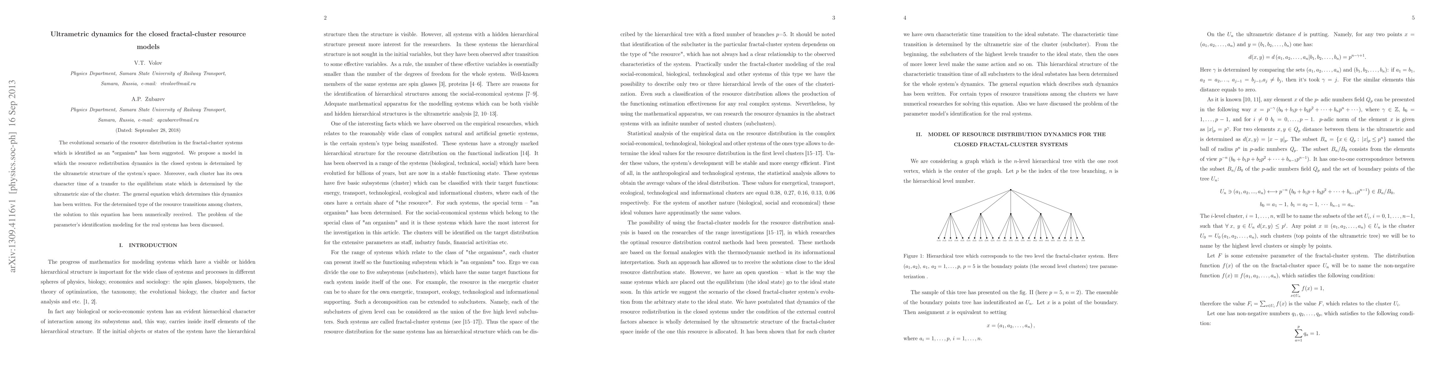The evolutional scenario of the resource distribution in the fractal-cluster systems which is identified as an "organism" has been suggested. We propose a model in which the resource redistribution dynamics in the closed system is determined by the ultrametric structure of the system's space. Moreover, each cluster has its own character time of a transfer to the equilibrium state which is determined by the ultrametric size of the cluster. The general equation which determines this dynamics has been written. For the determined type of the resource transitions among clusters, the solution to this equation has been numerically received. The problem of the parameter's identification modeling for the real systems has been discussed.