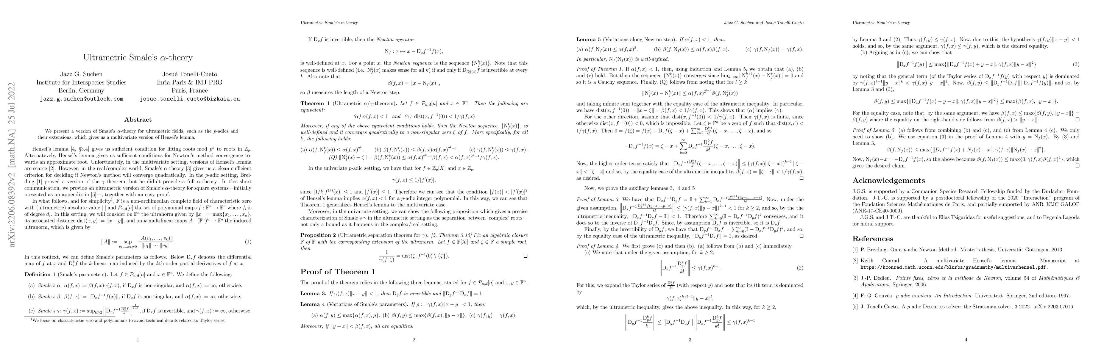 Summary: This paper introduces an ultrametric adaptation of Smale's $\alpha$-theory for $p$-adic fields, providing a multivariate extension of Hensel's lemma. The new approach is particularly useful for analyzing dynamical systems in non-Archimedean settings.