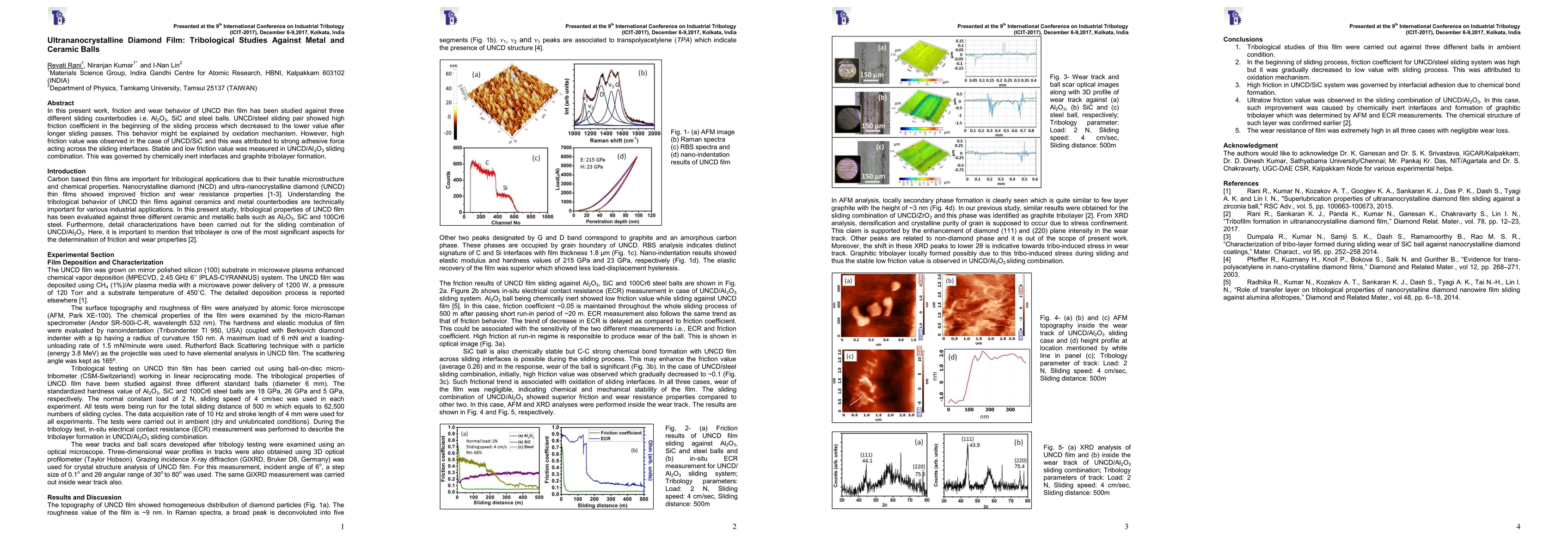 In this present work, friction and wear behavior of UNCD thin film has been studied against three different sliding counterbodies i.e. Al2O3, SiC and steel balls. UNCD/steel sliding pair showed high friction coefficient in the beginning of the sliding process which decreased to the lower value after longer sliding passes. This behavior might be explained by oxidation mechanism. However, high friction value was observed in the case of UNCD/SiC and this was attributed to strong adhesive force acting across the sliding interfaces. Stable and low friction value was measured in UNCD/Al2O3 sliding combination. This was governed by chemically inert interfaces and graphite tribolayer formation.