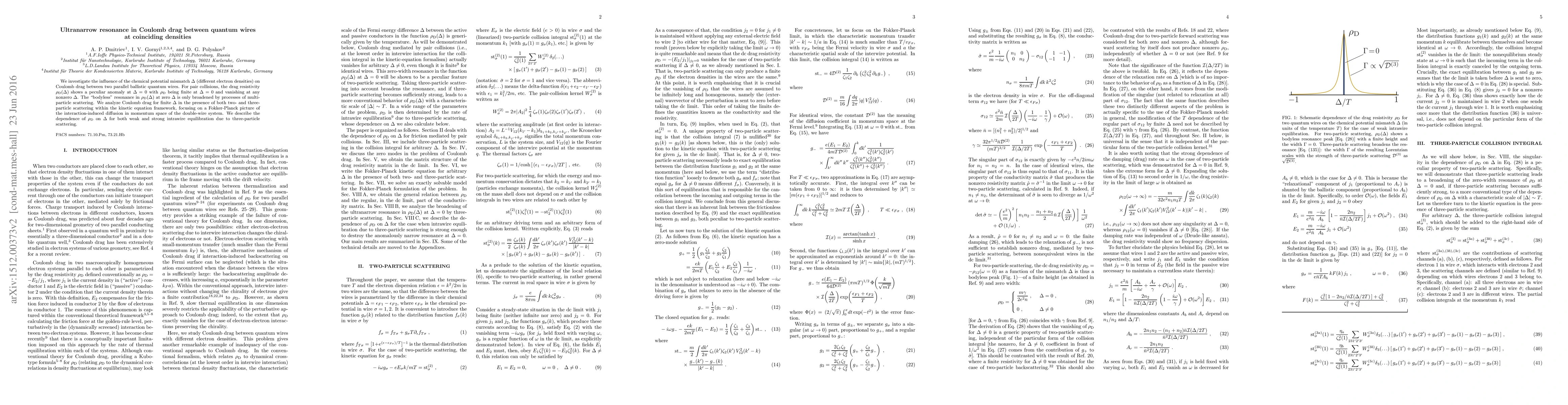 This paper explores Coulomb drag between two parallel quantum wires at coinciding electron densities, revealing an ultranarrow resonance in drag resistivity that persists at zero density mismatch and vanishes for nonzero mismatch. The study examines drag effects under various scattering conditions, highlighting the role of multi-particle interactions in shaping the drag behavior.