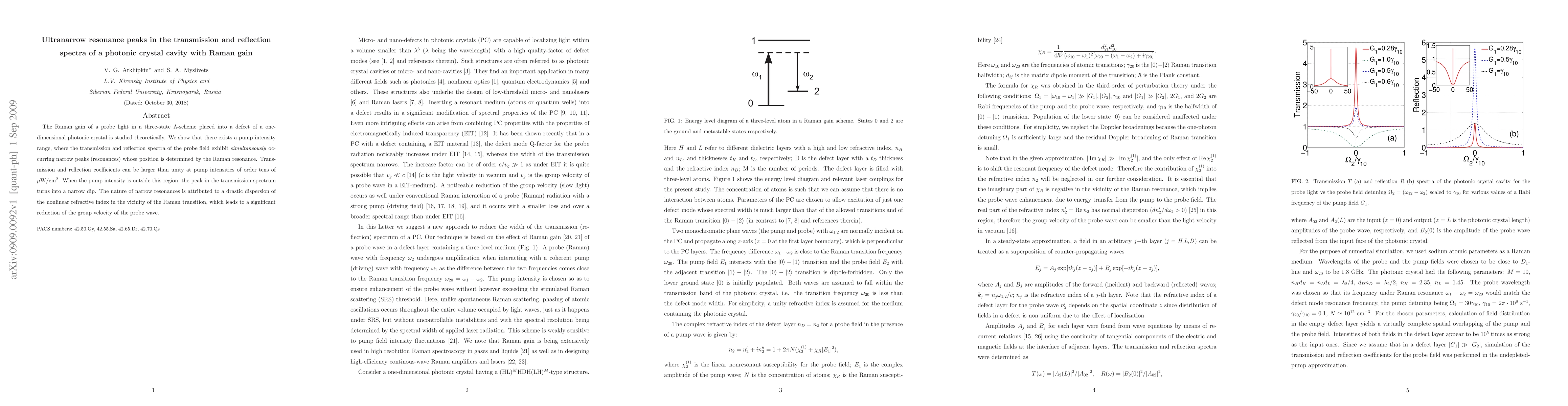 This paper investigates the Raman gain in a photonic crystal cavity, revealing ultranarrow resonance peaks in both transmission and reflection spectra within a specific pump intensity range. These peaks, determined by Raman resonance, can result in transmission and reflection coefficients exceeding unity.