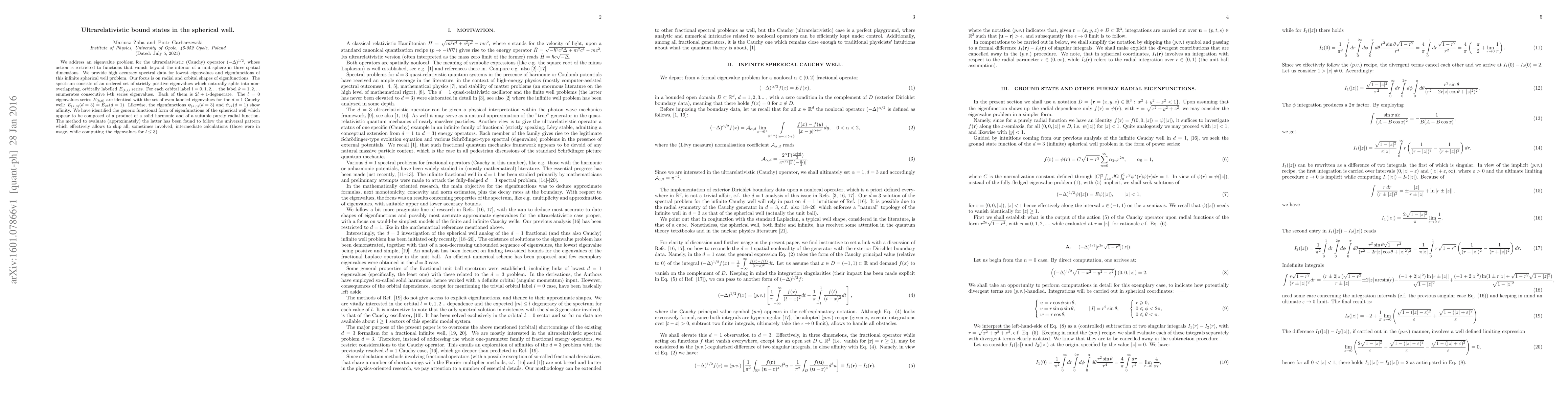 We address an eigenvalue problem for the ultrarelativistic (Cauchy) operator $(-\Delta )^{1/2}$, whose action is restricted to functions that vanish beyond the interior of a unit sphere in three spatial dimensions. We provide high accuracy spectral datafor lowest eigenvalues and eigenfunctions of this infinite spherical well problem. Our focus is on radial and orbital shapes of eigenfunctions. The spectrum consists of an ordered set of strictly positive eigenvalues which naturally splits into non-overlapping, orbitally labelled $E_{(k,l)}$ series. For each orbital label $l=0,1,2,...$ the label $k =1,2,...$ enumerates consecutive $l$-th series eigenvalues. Each of them is $2l+1$-degenerate. The $l=0$ eigenvalues series $E_{(k,0)}$ are identical with the set of even labeled eigenvalues for the $d=1$ Cauchy well: $E_{(k,0)}(d=3)=E_{2 k}(d=1)$. Likewise, the eigenfunctions $\psi_{(k,0 )}(d=3)$ and $\psi_{2k }(d=1)$ show affinity. We have identified the generic functional form of eigenfunctions of the spherical well which appear to be composed of a product of a solid harmonic and of a suitable purely radial function. The method to evaluate (approximately) the latter has been found to follow the universal pattern which effectively allows to skip all, sometimes involved, intermediate calculations (those were in usage, while computing the eigenvalues for $l \leq 3$).