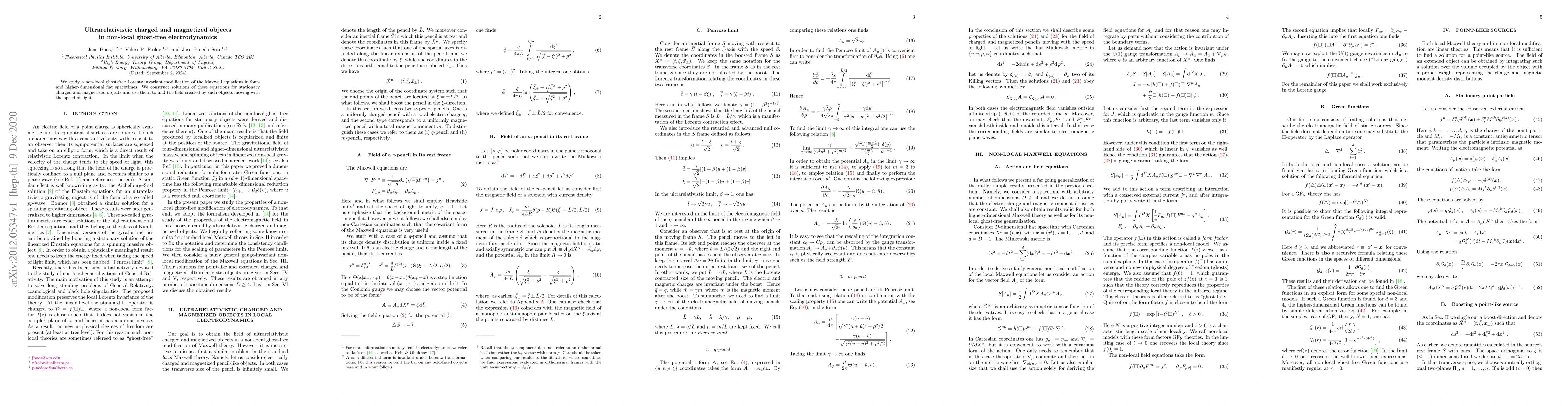 This paper explores a non-local, ghost-free modification of Maxwell's equations to describe ultrarelativistic charged and magnetized objects, providing solutions for their stationary states and the resulting fields when they move at the speed of light.