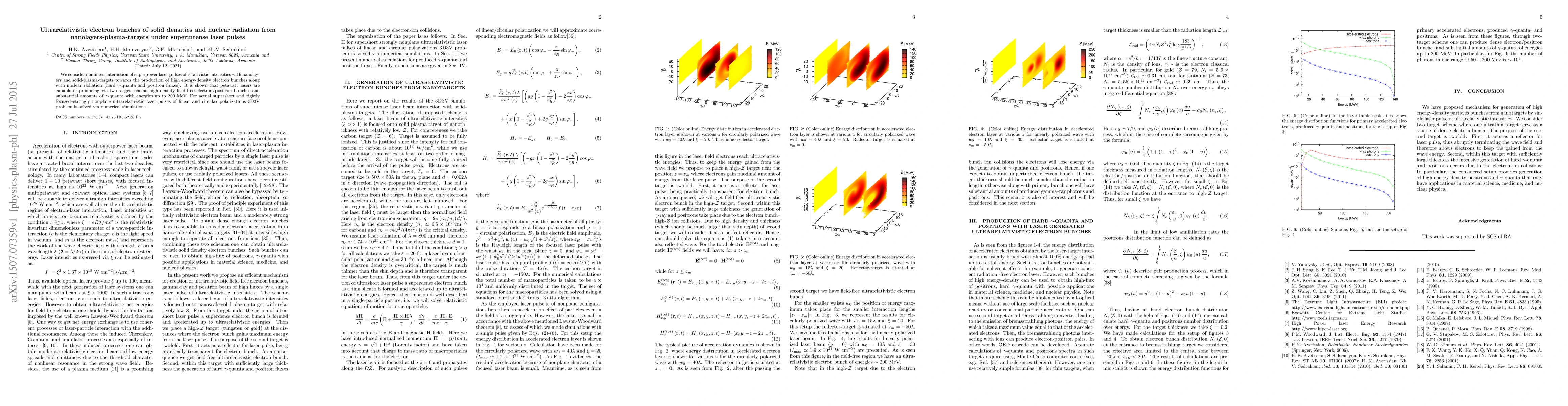 We consider nonlinear interaction of superpower laser pulses of relativistic intensities with nanolayers and solid-plasma-targets towards the production of high energy-density electron bunches along with nuclear radiation (hard $% \gamma $-quanta and positron fluxes). It is shown that petawatt lasers are capable of producing via two-target scheme high density field free electron/positron bunches and substantial amounts of $\gamma $-quanta with energies up to $200$ MeV. For actual supershort and tightly focused--strongly nonplane ultrarelativistic laser pulses of linear and circular polarizations 3D3V problem is solved via numerical simulations.
