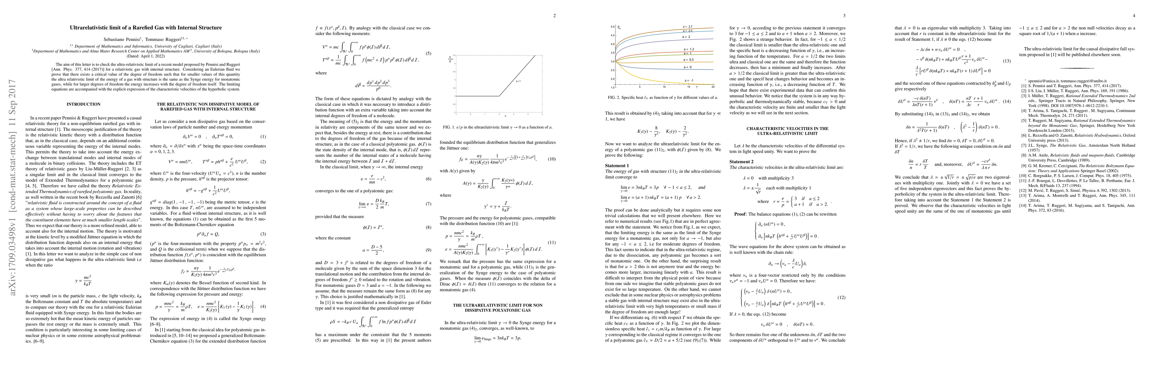This research examines the ultra-relativistic limit of a model for a relativistic gas with internal structure, proving a critical degree of freedom where the gas's energy aligns with the Synge energy for monatomic gases. The study also provides explicit characteristic velocities for the hyperbolic system.