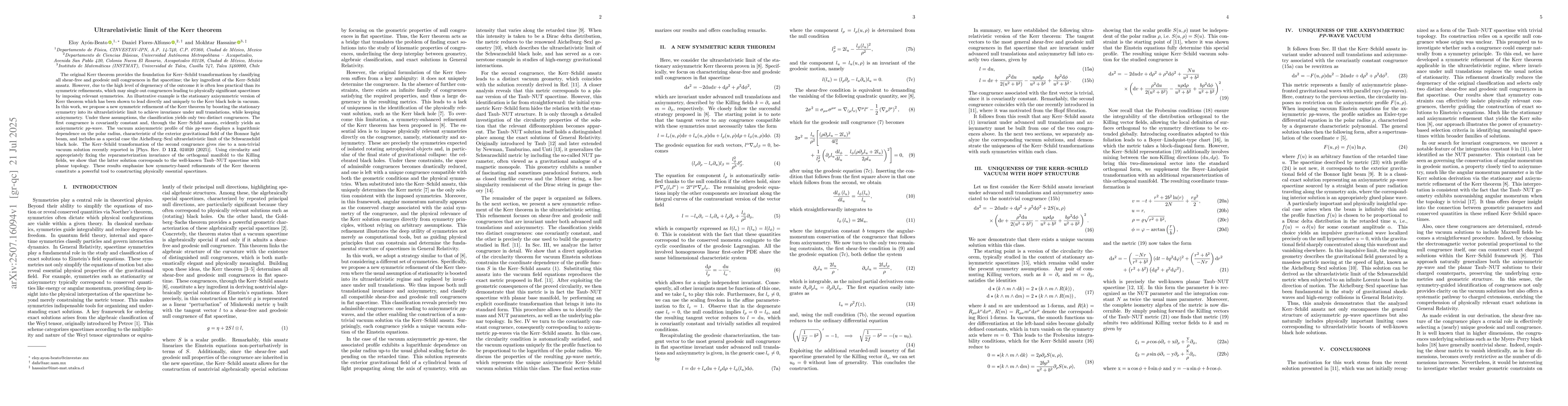 The original Kerr theorem provides the foundation for Kerr-Schild transformations by classifying all shear-free and geodesic null congruences in flat spacetime; the key ingredient of the Kerr-Schild ansatz. However, due to the high level of degeneracy of the outcome it is often less practical than its symmetric refinements, which may single out congruences leading to physically significant spacetimes by imposing relevant symmetries. An illustrative example is the stationary axisymmetric version of Kerr theorem which has been shown to lead directly and uniquely to the Kerr black hole in vacuum. In this work, we propose a new symmetric refinement of the Kerr theorem by boosting the stationary symmetry into its ultrarelativistic limit to achieve invariance under null translations, while keeping axisymmetry. Under these assumptions, the classification yields only two distinct congruences. The first congruence is covariantly constant and, through the Kerr-Schild ansatz, evidently yields an axisymmetric pp-wave. The vacuum axisymmetric profile of this pp-wave displays a logarithmic dependence on the polar radius, characteristic of the exterior gravitational field of the Bonnor light beam, and includes as a special case the Aichelburg-Sexl ultrarelativistic limit of the Schwarzschild black hole. The Kerr-Schild transformation of the second congruence gives rise to a non-trivial vacuum solution recently reported in [Phys. Rev. D 112, 024020 (2025)]. Using circularity and appropriately fixing the reparameterization invariance of the orthogonal manifold to the Killing fields, we show that the latter solution corresponds to the well-known Taub-NUT spacetime with planar topology. These results emphasize how symmetry-based refinements of the Kerr theorem constitute a powerful tool to constructing physically essential spacetimes.