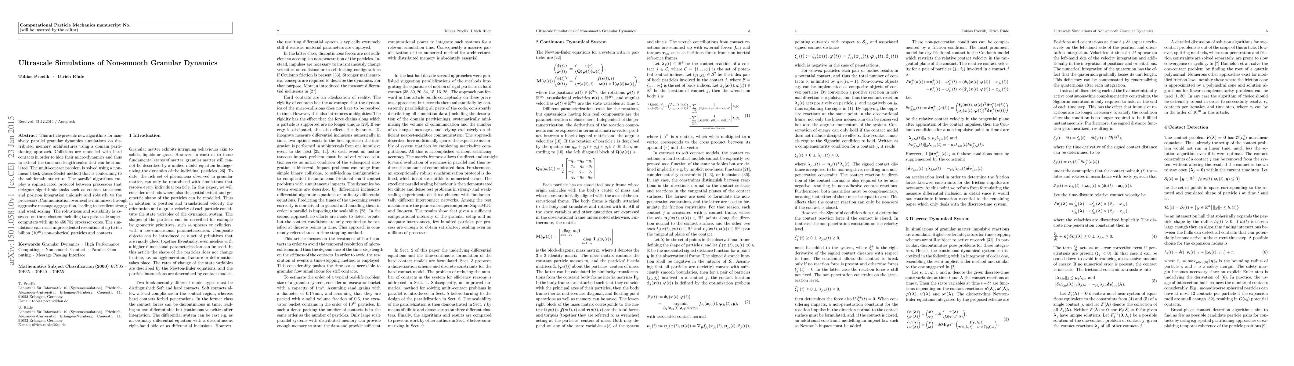 This article presents new algorithms for massively parallel granular dynamics simulations on distributed memory architectures using a domain partitioning approach. Collisions are modelled with hard contacts in order to hide their micro-dynamics and thus to extend the time and length scales that can be simulated. The multi-contact problem is solved using a non-linear block Gauss-Seidel method that is conforming to the subdomain structure. The parallel algorithms employ a sophisticated protocol between processors that delegate algorithmic tasks such as contact treatment and position integration uniquely and robustly to the processors. Communication overhead is minimized through aggressive message aggregation, leading to excellent strong and weak scaling. The robustness and scalability is assessed on three clusters including two peta-scale supercomputers with up to 458752 processor cores. The simulations can reach unprecedented resolution of up to ten billion non-spherical particles and contacts.