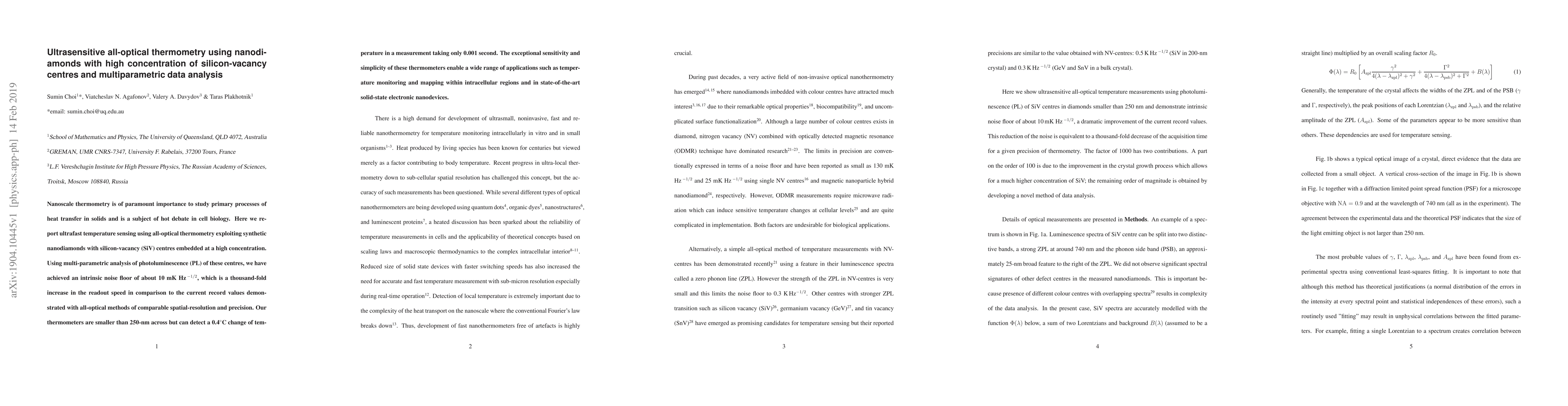 This paper reports ultrasensitive all-optical thermometry using nanodiamonds with high silicon-vacancy centre concentrations, achieving an intrinsic noise floor of 10 mK Hz$^{-1/2}$ and a thousand-fold increase in readout speed. The nanoscale thermometers can detect 0.4°C changes in 0.001 seconds, enabling applications in cell biology and solid-state electronics.