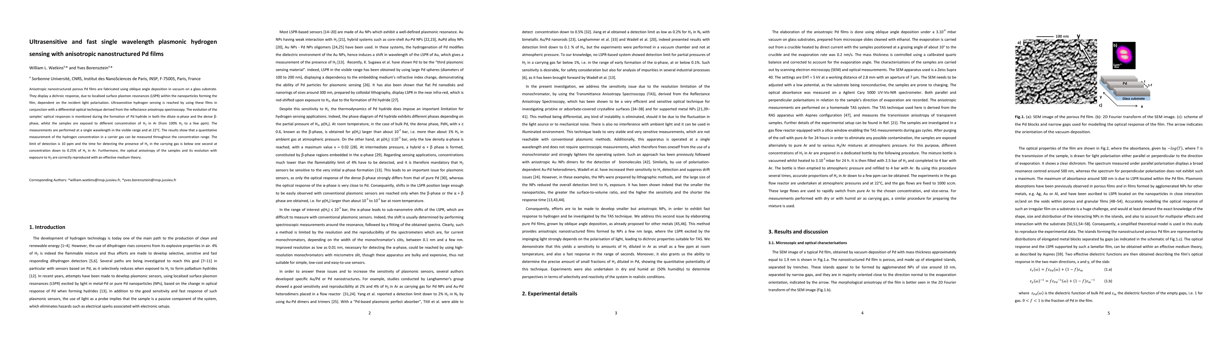 This paper presents ultrasensitive hydrogen sensing using anisotropic nanostructured Pd films fabricated via oblique angle deposition, achieving a detection limit of 10 ppm and a response time of less than one second. The technique leverages localized surface plasmon resonances and differential optical measurements.
