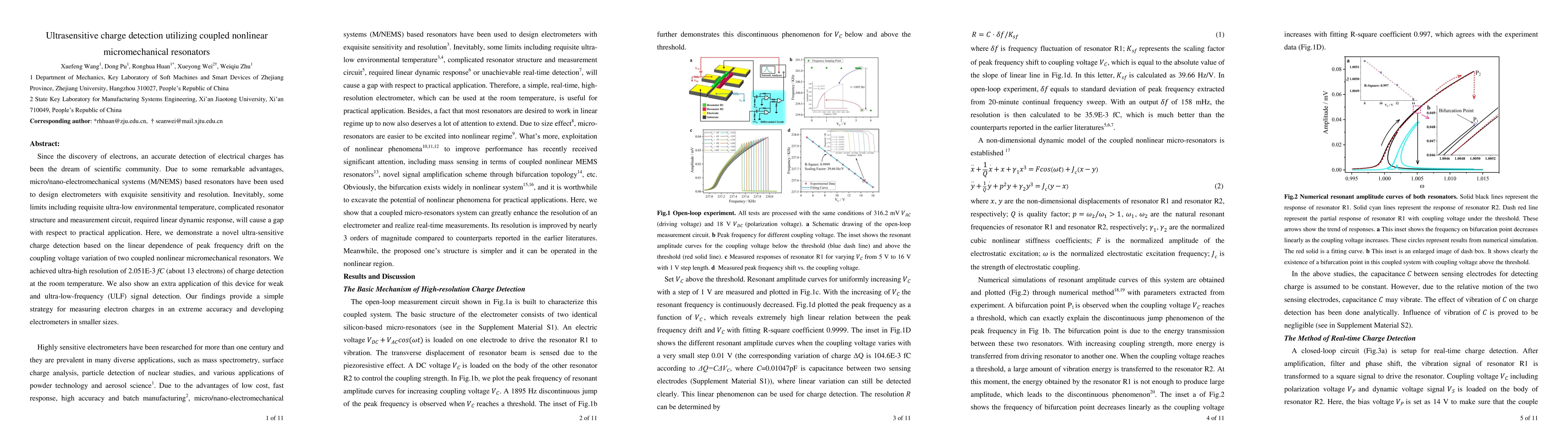 Since the discovery of electrons, an accurate detection of electrical charges has been the dream of scientific community. Due to some remarkable advantages, micro/nano-electromechanical systems (M/NEMS) based resonators have been used to design electrometers with exquisite sensitivity and resolution. Inevitably, some limits including requisite ultra-low environmental temperature, complicated resonator structure and measurement circuit, required linear dynamic response, will cause a gap with respect to practical application. Here, we demonstrate a novel ultra-sensitive charge detection based on the linear dependence of peak frequency drift on the coupling voltage variation of two coupled nonlinear micromechanical resonators. We achieved ultra-high resolution of 2.051E-3 fC (about 13 electrons) of charge detection at the room temperature. We also show an extra application of this device for weak and ultra-low-frequency (ULF) signal detection. Our findings provide a simple strategy for measuring electron charges in an extreme accuracy and developing electrometers in smaller sizes.